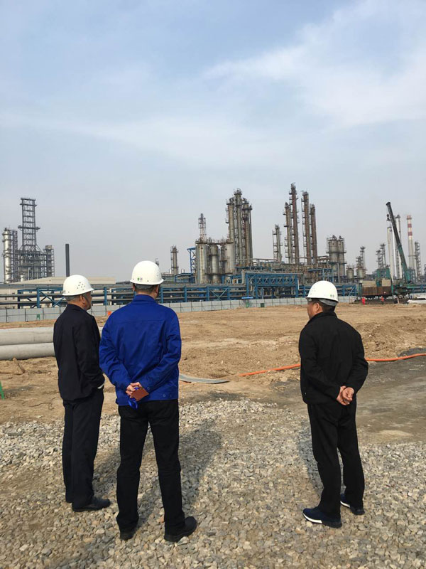 △圖為濱化集團(tuán)張忠正董事長(zhǎng)、濱陽公司李嘉驪總經(jīng)理陪同我公司謝同寶董事長(zhǎng)參觀濱化集團(tuán)在建工程