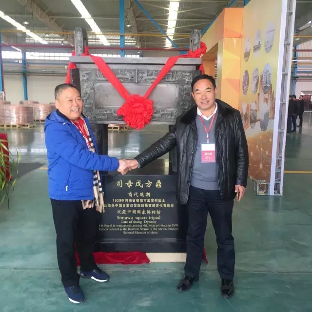 △圖為謝同寶董事長與遼寧高威趙家發(fā)副總經(jīng)理在我公司贈(zèng)送的大型銅鼎旁合影留念