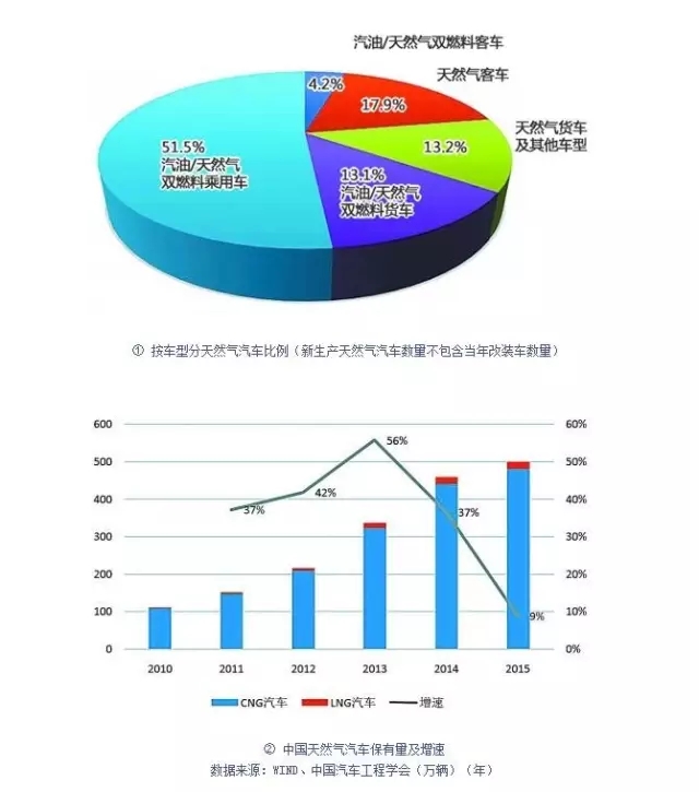 20世紀80年代末至21世紀初,中國天然氣汽車先實現(xiàn)了從無到有的突破,隨后經(jīng)歷了從有到多的跨越,在20多年時間里穩(wěn)步增長至100萬輛,2010年以后更是進入爆發(fā)式增長。2010年至2015年,中國天然氣汽車保有量從110萬輛輛迅猛發(fā)展至年約500萬輛(其中LNG汽車約20萬輛),年均增長率超過40%。在全世界約2000萬輛天然氣汽車中,平均每4輛中就有1輛在中國,中國已成為全世界天然氣汽車保有量的第一大國。