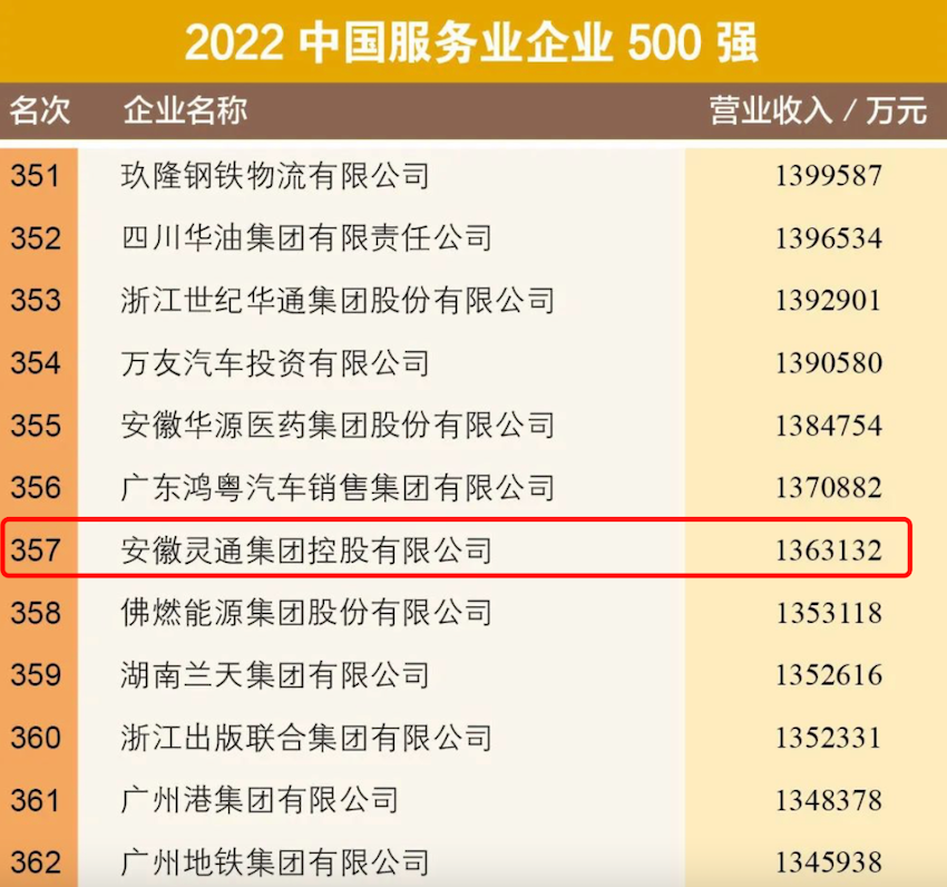 9月6日,中國(guó)企業(yè)聯(lián)合會(huì)、中國(guó)企業(yè)家協(xié)會(huì)聯(lián)合發(fā)布了“2022中國(guó)企業(yè)500強(qiáng)”、“2022中國(guó)服務(wù)業(yè)企業(yè)500強(qiáng)”等名單。安徽靈通集團(tuán)邁進(jìn)中國(guó)服務(wù)業(yè)500強(qiáng),位列第357位。