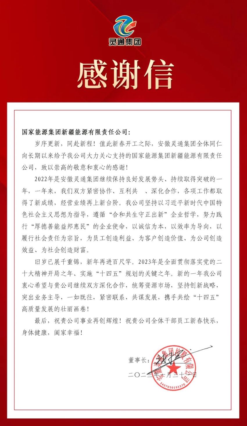 隨后,安徽靈通集團(tuán)回函感謝,對(duì)長(zhǎng)期以來給予集團(tuán)大力關(guān)心支持的國(guó)家能源集團(tuán)新疆能源公司致以崇高的敬意和衷心的感謝。并表示在新的一年里雙方將繼續(xù)深化合作,統(tǒng)籌資源市場(chǎng),在全面貫徹落實(shí)黨的二十大精神開局之年、實(shí)施“十四五”規(guī)劃的關(guān)鍵之年,攜手共繪未來高質(zhì)量發(fā)展的壯麗畫卷!