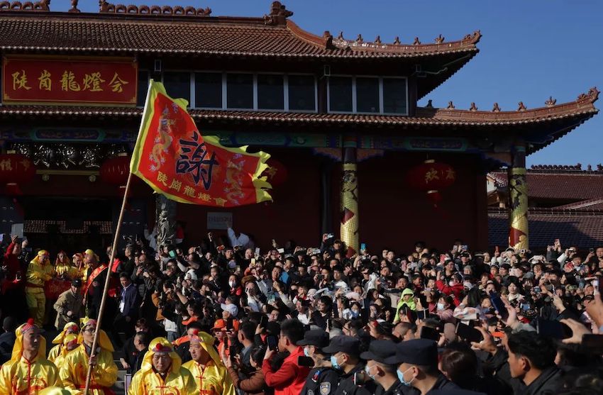 隨著幾聲鑼響,龍燈會(huì)長(zhǎng)一聲號(hào)令,頭戴明黃巾、身著明黃色傳統(tǒng)服飾的大漢抬著巨大的龍頭,在萬(wàn)眾矚目下向著謝氏宗祠門口的人群緩緩走來(lái)。鑼鼓聲、鞭炮聲響成了一片,數(shù)千人涌過(guò)來(lái)近距離看“巨龍”,給一年討個(gè)好“彩頭”,現(xiàn)場(chǎng)熱鬧非凡。