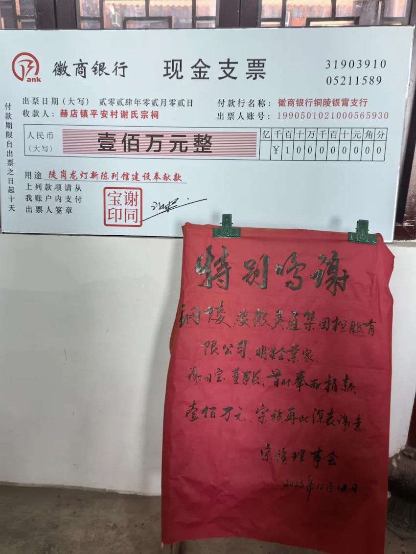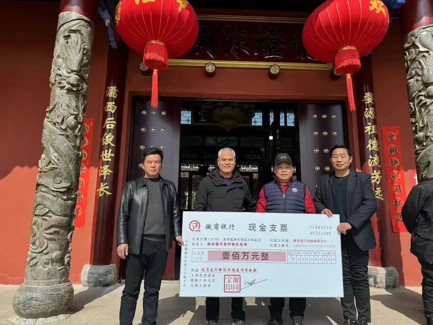 開(kāi)幕儀式上,赫店鎮(zhèn)平安村謝氏宗祠接受安徽靈通集團(tuán)董事長(zhǎng)謝同寶奉獻(xiàn)的100萬(wàn)元建設(shè)款項(xiàng),并向董事長(zhǎng)謝同寶頒發(fā)鳴謝證書。